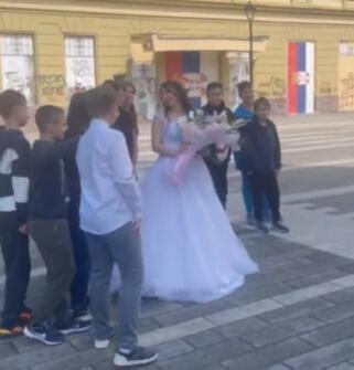 Naime, na Tik Toku je objavljen je video na kojem se vide učenici petog razreda jedne škole u Pančevu kako odlučnim korakom stižu ispred opštine. Razredna u venčanici ih primećuje, njeno iznenađenje je iskreno. Predaju joj cveće, a onda se i trubači pridružuju.