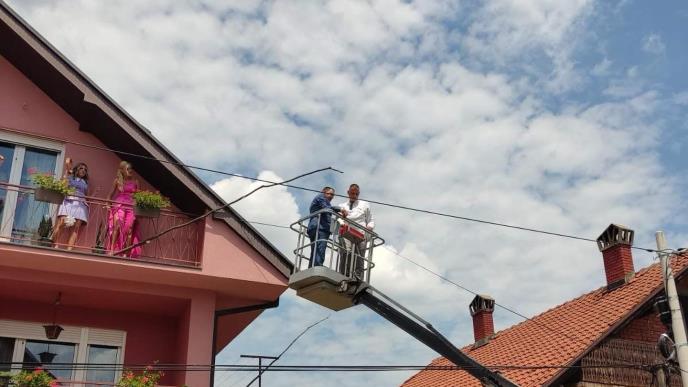 Mladoženja Aleksandar Marinković koji je došao u ulicu Mladena Žujovića po mladu Valentinu popeo se pomoću dizalice sa korpom do jabuke, skinuo je i pojeo, a od gostiju je nagrađen aplauzom i ovacijama.