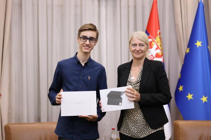 Ministarka nauke, tehnološkog razvoja i inovacija dr Jelena Begović organizovala je juče prijem za Drobnjakovića u zgradi Vlade Srbije, gde je ovom vrednom momku uručila i prigodan poklon.