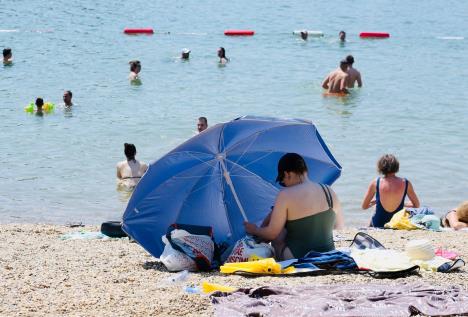 Već do podneva je danas bilo ko oko puno. A ljudi su samo pristizali. Žalili su nam se da ih je sunce već "puklo u glavu", da jedva čekaju da dođu do vode. U debeloj hladovini porodice s decom zauzele su mesto još u jutarnjim satima. Kažu da ne planiraju da se pomeraju do kasno uveče.