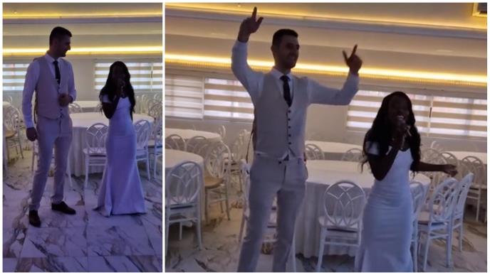 Snimak je objavila na svom Tiktoku. U prelepoj i zanosnoj venčanici zapevala je gostima pesmu "Veseli se srpski rode".