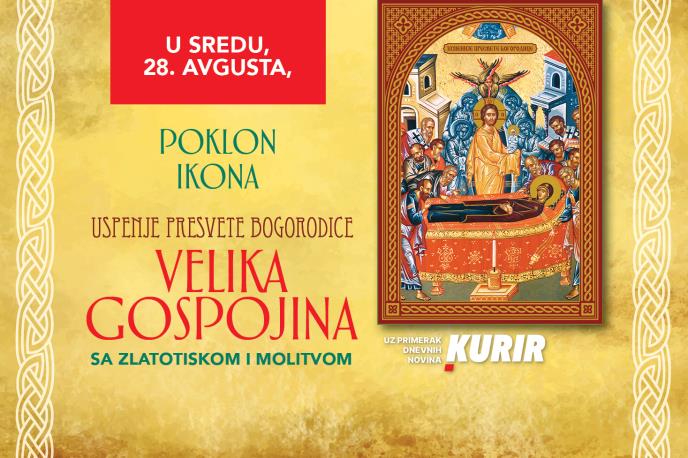Povodom praznika Velika Gospojina, Kurir vam donosi poseban poklon – ikonu Velike Gospojine. Uz svaki primerak dnevnih novina Kurir, ovog ponedeljka dobijate svetu ikonu, koja će uneti mir i blagoslov u vaš dom.