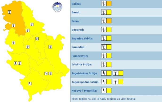 Na teritoriji cele Srbije na snazi je meteo alarm žute boje zbog najavljenih vrućina i a ponegde i obilnijih padavina, osim u Beogradu, gde nema aktivnog meteo alarma.