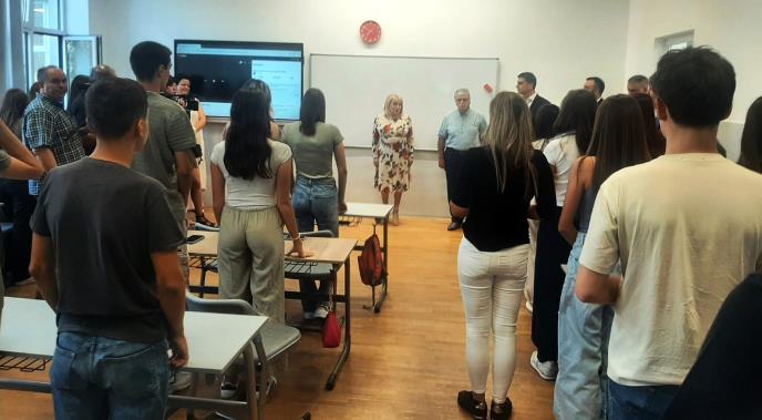 Školska godina, odnosno prvi čas počeo je intoniranjem himne Srbije "Bože pravde".