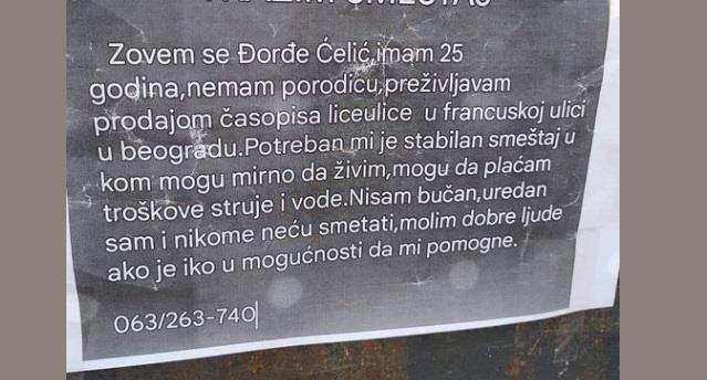 - Zovem se Đorđe Ćelić, imam 25 godina, nemam porodicu. Preživljavam prodajom časopisa Liceulice u Francuskoj ulici u Beogradu. Potreban mi je stabilan smeštaj u kom mogu mirno da živim. Mogu da plaćam troškove struje i vode. Nisam bučan, uredan sam, i nikome neću smetati. Molim dobre ljude ako je iko u mogućnosti da mi pomogne - napisao je Đorđe i ostavio broj telefona 063/263-740.