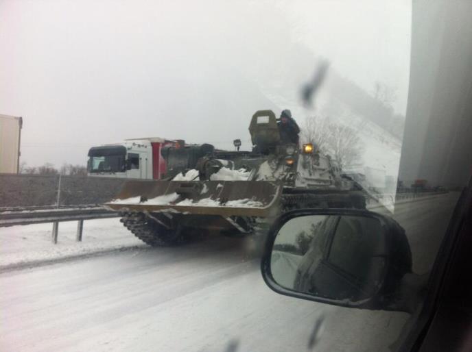 Na društvenoj mreži Tviter pojavila se fotografija zavejanog puta u Mađarskoj kojim jezdi tenk sa grtalicom! Slika je objavljena na Tviter nalogu @ebertek uz objašnjenje da je vojno vozilo viđeno nadomak Pešte. Zasad nema informacija da li se i vojska uključila u spasavanje na hiljade zavejanih ljudi ili je ovaj tenk bio samo u prolazu ka nekom vojnom objektu.