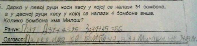 "Darko ima 66 bombona, a za Miloša ne znam", napisao je osnovac u svom odgovoru.