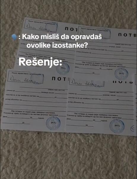 Tiktok i Instagram preplavili su profili i objave o prodaji lekarskih opravdanja za osnovce i srednjoškolce koji beže iz škole, ali ne žele da dobiju neopravdane. U objavama se navodi da je opravdanje overeno pečatom i uz to garantuju "prolaznost 100 odsto". Svi profili imaju slične nazive "opravdanja Beograd", "opravdanja Srbija", "opradanjaaa", "opravdanja Novi Pazar" i svima je zajedničko to što nude falsifikovani dokument.