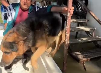 Voda je vikendice poplavila do visine prozora, ljuljaške se jedva naziru, a meštani sede na stepenicama.