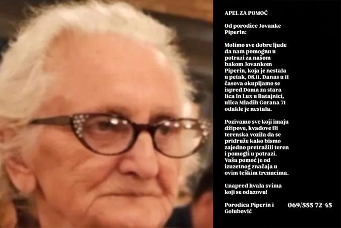 - Molimo sve dobre ljude da nam pomognu u potrazi za našom bakom Jovankom Piperin koja je nestala u u petak 8. novembra. Danas u 11 časova okupljamo se ispred Doma za stara lica "In Lux" u Batajnici, ulica Mladih Gorana 71 odakle je nestala. Pozivamo sve koji imaju džipove, kvadove ili terenska vozila da se pridruže kako bismo zajedno pretražili teren i pomogli u potrazi. Vaša pomoć je od izuzetnog znaja u ovim teškim trenucima. Unapred hvala svima koji se odazovu - apel za pomoć potpisuju porodice Piperin i Golubović.