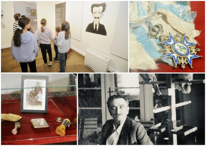 Karikature na sve strane. Komediograf kroz mnogo viđenja, pa i Bete Vukanović, koja mu daruje lovorike. Ali najveća, na centralnom mestu, jeste Nušića na konju, s turbanom. I to baš nad vitrinom u kojoj je silno ordenje (a sve nije moglo stati na ovu izložbu), pa i Orden Svetog Save, Orden belog orla...