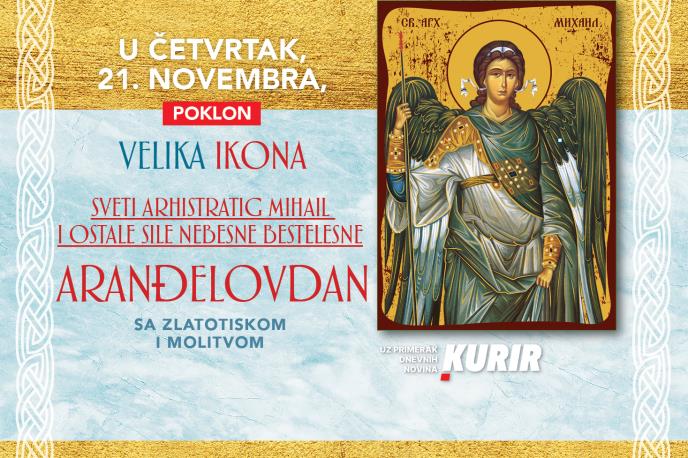 U četvrtak, 21. novembra, Kurir vas daruje povodom jednog od najvećih praznika u pravoslavnom kalendaru – Aranđelovdana. Uz svaki kupljeni primerak Kurira, na poklon dobijate prelepu ikonu Svetog Arhangela Mihaila, izrađenu u zlatotisku, kao simbol zaštite, snage i vere.