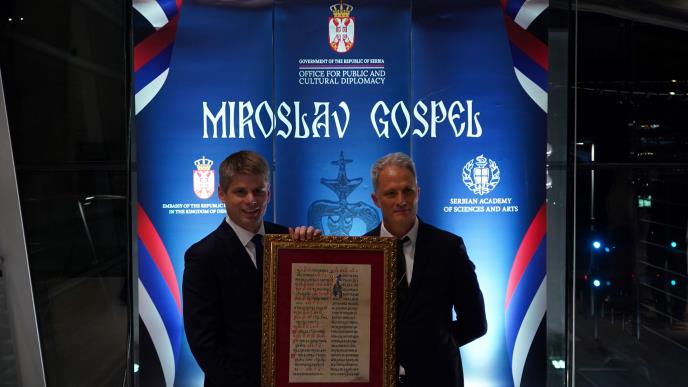 Gujon je zameniku direktora Kraljevske biblioteke uručio poklon - prepis Miroslavljevog jevanđelja na kaligrafski način, na pergamentu sa minijaturama u 24 karatnom zlatu.