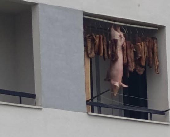 Ovog puta u centru pažnje našao se žitelj Futoga, stanar stambene zgrade koji je, kao da je sam u svom dvorištu na selu, okačio meso da se suši. Sve pečenica do pečenice a u samom centru - celo prase.