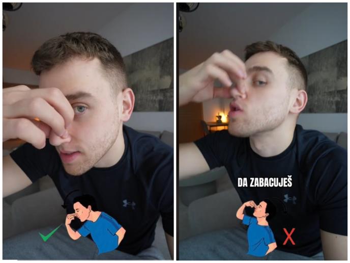 - Nikako nemoj da zabacuješ glavu i da dižeš levu ruku kada ti nos krvari, već uradi ovo. U tom trenutku što jače izduvaj nos i nagni glavu napred i stisni. Da treba da zabacite glavu i da podignete ruku je apsolutna laž - objasnio je on.