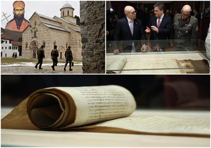 Dečanska povelja jedno je od najvećih istinskih blaga našeg roda jer svedoči o najdubljim korenima srpskog identiteta i jedna je od najvrednijih srpskih tapija na našu zemlju - naglasili su premijer u ostavci Miloš Vučević i ministar kulture Nikola Selaković povodom izlaganja za javnost Dečanske hrisovulje, kojom je kralj Stefan Uroš III osnovao Visoke Dečane 1330. godine, a sve u čast Sretenja - Dana državnosti Srbije.