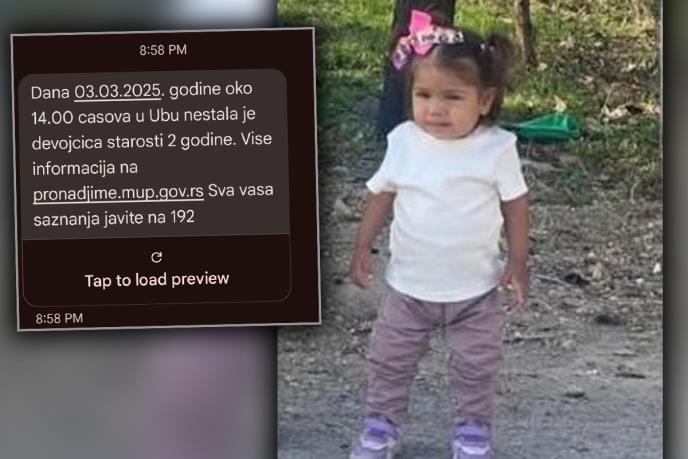 - Dana 03.03.2025. godine oko 14.00 casova u Ubu nestala je devojčica starosti 2 godine. Više informacija na pronađime.mup.gov.rs Sva vaša saznanja javite na 192 - navedeno je u poruci.