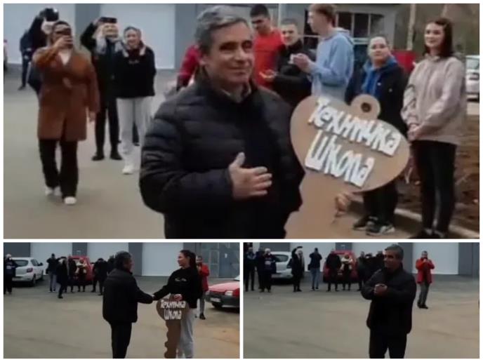 Direktora su u dvorištu škole sačekali đaci, a jedna učenica mu je simbolično predala ključ na kojoj stoji natpis "Tehnička škola". Đorđević je bio oduševljen ovim dilrljivim prizorom i dok je šetao pored učenika sve vreme se zahvaljivao.