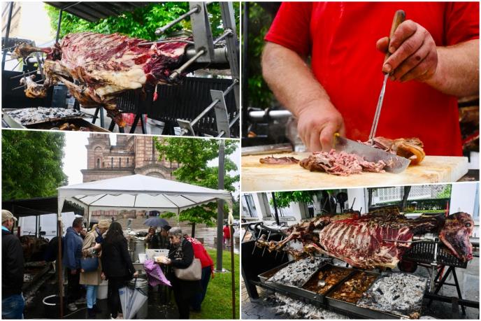 Ispred Crkve Svetog Marka na ražnju ispečen vo od 610 kila za Markovdan! Ljudi i deca posle liturgije svratili da probaju specijalitet: Pekao se 12 sati FOTO