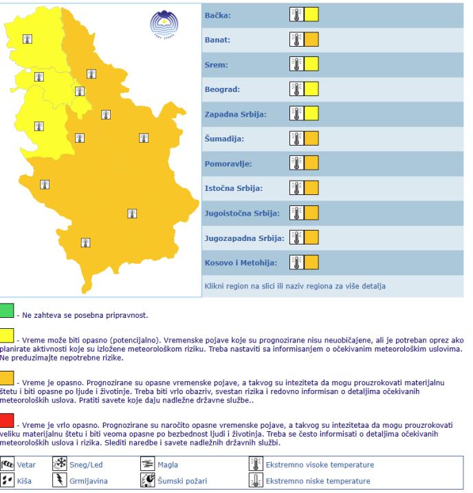 U većem delu Srbije na snazi je narandžasti meteo alarm zbog ekstremno visoke temperature. Ovo upozorenje znači da je vreme opasno: Prognozirane su opasne vremenske pojave, a takvog su inteziteta da mogu prouzrokovati materijalnu štetu i biti opasne po ljude i životinje. Treba biti vrlo obazriv, svestan rizika i redovno informisan o detaljima očekivanih meteoroloških uslova. Pratiti savete koje daju nadležne državne službe...