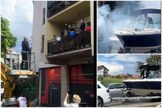 Neobičan prizor dodatno je začinila objava na TikToku koju je podelila mladoženjina snaja, uz pitanje: „Šta radi gliser u dvorištu?“ Nakon svečanog dolaska, mladoženja je uz pomoć autodizalice došao do terase svoje izabranice, što je među gostima izazvalo pravo oduševljenje.