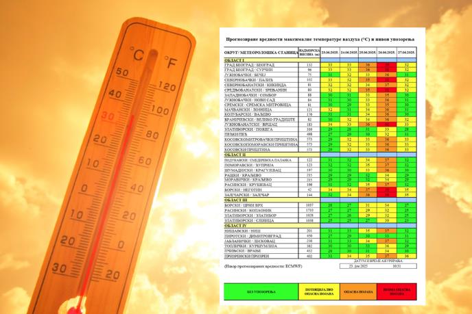 - Prognozirane vrednosti maksimalne dnevne temperature vazduha biće u domenu veoma opasne pojave 26. juna na teritoriji grada Beograda i južnobanatskog okruga od 30. juna do 2. jula, a potencijalno i na teritoriji grada Beograda, severnobačkog, srednjobanatskog, južnobanatskog, borskog i zaječarskog okruga u periodu od 24. do 27. juna.