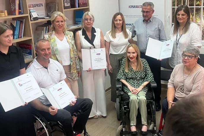 Dobitnicima nagrada, zahvalnice i lap-top računare koji su obezbeđeni u okviru projekta NOOIS-a pod nazivom “Za inkluzivnu i održivu budućnost“ odobrenog na Programskom konkursu za unapređenje položaja osoba sa invaliditetom u Republici Srbiji Sektora za zaštitu osoba sa invaliditetom u 2025. godini, u ukupnom iznosu od 280.000 din, uručile su pomoćnik ministra Biljana Barošević i predsednica NOOIS-a Tatjana Stojšić Petković.