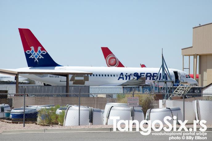 Reč je o jednom od prvih pet iznajmljenih aviona "Er Srbije" (Air Serbia) "erbas A319" N473TA, bivšem vazduhoplovu avio-kompanije "Viaja Volaris". Srpski avion je upravo izašao iz farbare kompanije AeroTurbine na aerodromu u Arizoni.