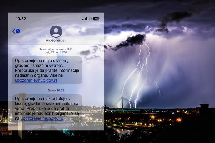 Nevreme koje je juče zahvatilo Srbiju ne smiruje se ni danas, a Ministarstvo unutrašnjih poslova uputilo je hitno upozorenje građanima putem SMS poruke koju su već mnogi dobili na svojim mobilim telefonima.