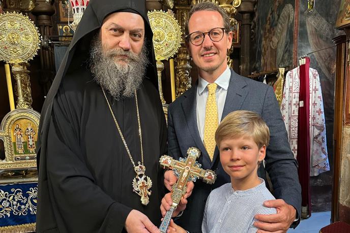 U jednom od najemotivnijih trenutaka posete, sedmogodišnji princ Stefan u rukama je nosio srebrni krst koji je 1910. godine darovao njegov čukundeda, kralj Petar I. Krst, ukrašen dragim kamenjem i izrađen u Carskoj Rusiji, predstavlja jedan od najdragocenijih darova u istoriji Hilandara i čuva se u oltaru velike crkve manastira.