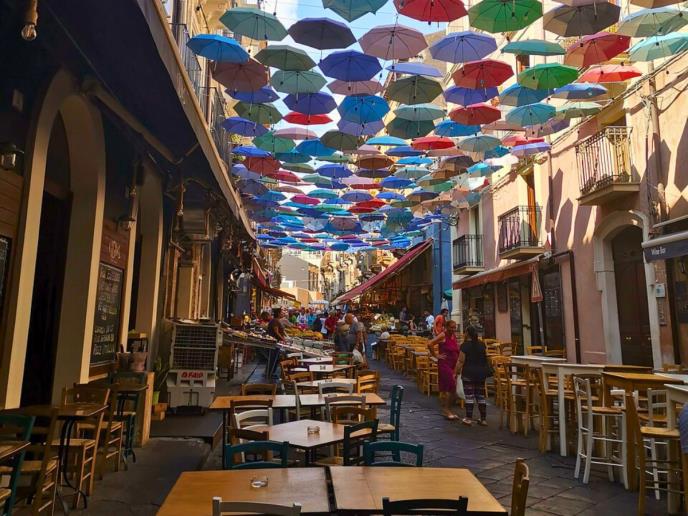 Jedna od prvih slika koje će vam ostati u sećanju je šarena ulica sa visećim kišobranima, mala umetnička oaza skrivena između kamenih zgrada, prikazujući simbol duha Katanije . Vesela, nepretenciozna, jednostavna, a nezaboravna. U toj ulici često ćete sresti decu kako igraju fudbal, bake koje ćaskaju s prozora i turiste koji zastaju da udahnu taj prizor, jer to nije samo boja, to je energija.