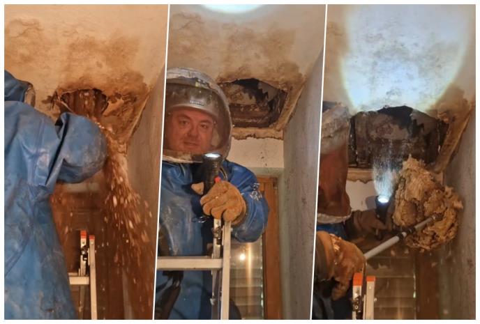 Vladica se, noseći na sebi specijalno pčelarsko zaštitno odelo za stršljenove, popeo na merdevine u jednom domaćinstvu u Srbiji, alatom napravio rupu u plafonu, a ono što je iz nje ispalo mnoge je ostavilo u čudu.