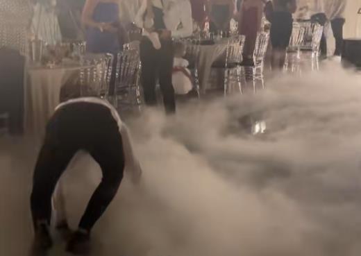 Na njemu se vidi mlađi muškarac u svečanoj kombinaciji kako se baca po scenskom dimu, pokretima kao da uskače u vodu – dok mladenci, baš kao i kamerman, pokušavaju da održe fokus na trenutku koji je trebalo da ostane romantičan.