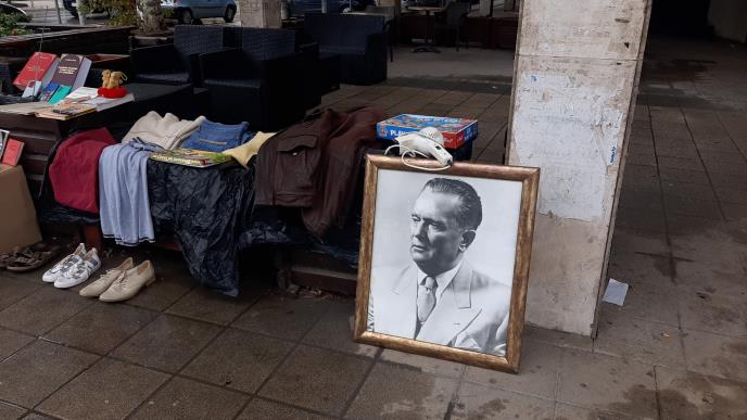 LOZNICA - Lozničanima ovih dana pažnju privlači improvizovano prodajno mesto u centru grada gde jedan njihov sugrađanin prodaje različite stvari, a jedna izazova posebnu znatiželju. Među starom garderobom i obućom, jaknama, kapama i pantalonama, nalaze se knjige, od Krivičnog prava do nekoliko dela dr Vojislava Šešelja, ali i velika uramljena slika sa likom Josipa Broza Tita.