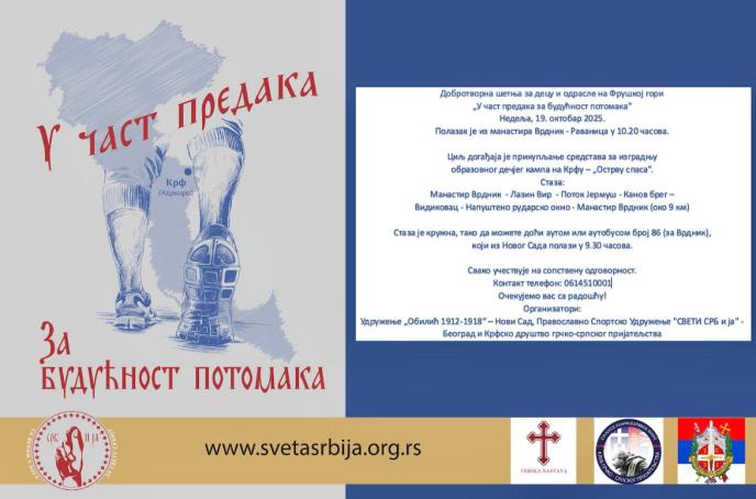 U nedelju, 19. oktobra 2025. godine, Sveta Srbija zajedno sa Udruženjem „Obilić 1912-1918“ iz Novog Sada i Društvom grčko-srpskog prijateljstva sa Krfa, organizuje dobrotvornu šetnju za decu i odrasle na Fruškoj gori i posetu manastiru Vrdnik – Ravanica.