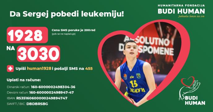Pomozimo Sergeju da pobedi leukemiju uplatom na dinarski račun 160-6000002498304-36, uplatom na devizni račun 160-6000002498947-47, ili slanjem jednokratne pomoći u iznosu od 200 dinara SMS sa tekstom 1928 na broj 3030.