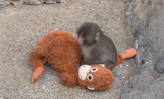 Mladunče majmuna u japanskom zoološkom vrtu sa plišanom igračkom Foto: Printscreen X