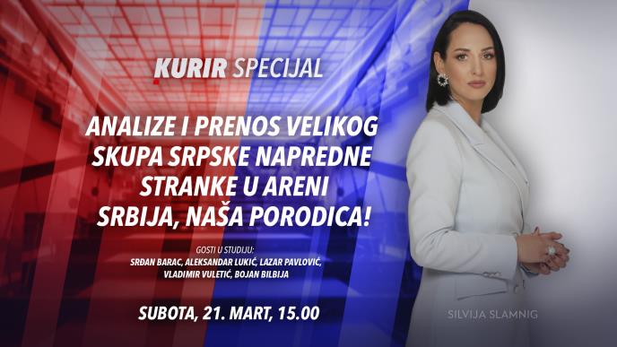 Danas od 15.00 na Kurir televiziji emitujemo specijal povodom održavanja velikog skupa Srpske napredne stranke u Areni, skup pod sloganom “SRBIJA, NAŠA PORODICA!”.