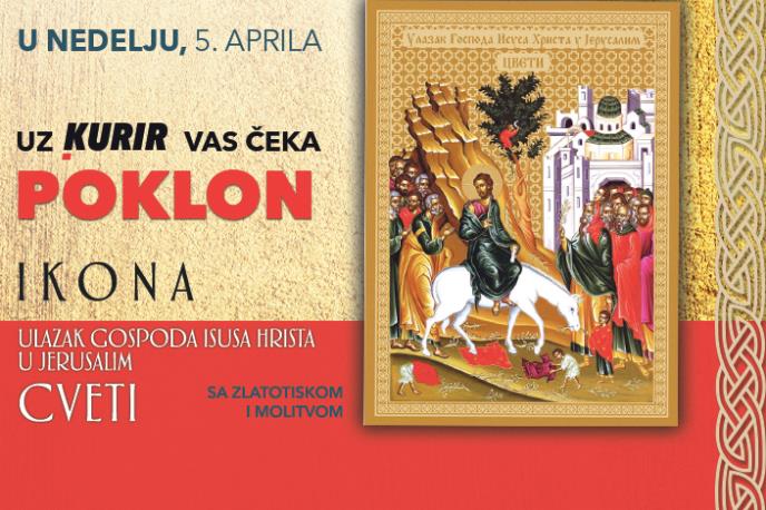 Srpska pravoslavna crkva i vernici u nedelju, 5. aprila slave praznik Cveti, koji se slavi u svim hrišćanskim zemljama, ali s neznatnom razlikom u običajima. Tim povodom Kurir čitaocima daruje ikonu Ulazak Gospoda Isusa Hrista u Jerusalim, sa zlatotiskom i molitvom.
