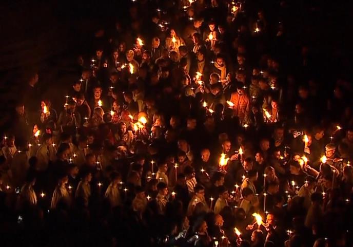 U jednom trenutku svetlost obasjava Kuvukliju, patrijarh izlazi sa upaljenim svećama i vernici plamenom tih sveća pale svoje.