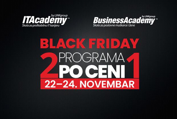 Da podsetimo, akcija Black Friday traje od 22. do 24. novembra i samo u ovom periodu možete upisati dva programa na ITAcademy ili BusinessAcademy po ceni jednog. Prijavite se ako želite da se usavršite za više IT oblasti ili ste zainteresovani da započnete razvoj svojih poslovnih veština.