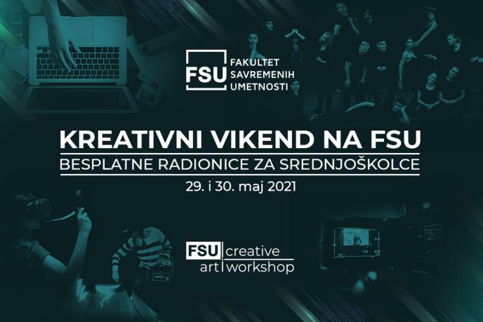 Ako idete u srednju školu, a imate talenta za umetnost i volite različite kreativne stvari, onda bi 29. i 30. maja trebalo da budete na Fakultetu savremenih umetnosti. FSU i ove godine organizuje Creative Workshop Art Weekend. Biće organizovane radionice iz osam različitih oblasti: iz grafičkog dizajna, glume, dizajna enterijera, slikarstva, modnog dizajna, multimedijalne produkcije, novinarstva, muzičkih komunikacija.