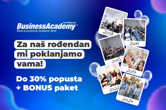 Podsećamo: rođendanska akcija BusinessAcademy traje do 15. septembra. Ukoliko i vi želite da ostvarite uspešnu poslovnu karijeru, sada je pravi trenutak da načinite prvi korak. Iskoristite fantastičan popust na cenu upisa i po najpovoljnijim uslovima steknite tražena praktična znanja.