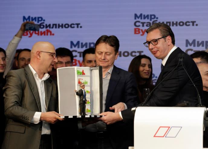 Ovaj momenat simboliše predsednikov predizborni spot koji je za kratko vreme dostigao veliku popularnost, a u kojem Vučić izlazi iz frižidera.