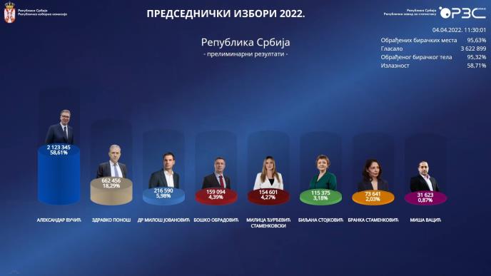 BEOGRAD - Predsednički kandidat SNS Aleksandar Vučić osvojio je 58,61 odsto glasova na izborima, dok je na drugom mestu kandidat Ujedinjenih za pobedu Srbije Zdravko Ponoš sa 18,29 odsto, saopštila je danas Republička izborna komisija (RIK) na osnovu 95,32 procenata obrađenih glasova.
