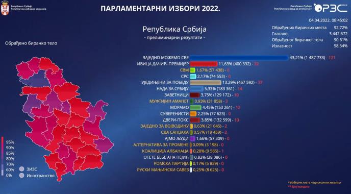 Kako se navodi na sajtu RIK-a, najviše glasova osvojila je koalicija oko Srpske napredne stranke - 43,45 odsto glasova, što bi im po trenutnim rezultatima donelo 122 mandata.