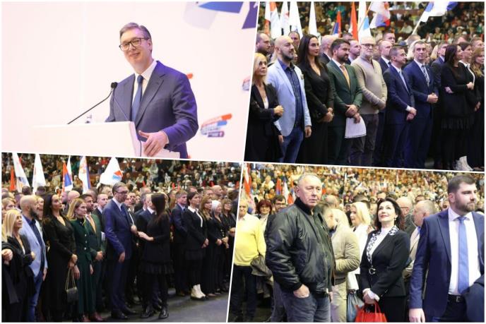 - Radostan sam što vidim mnogo mladih i što ste veseli, slavite pobedu - rekao je Vučić u prepunoj hali Spens, dok su okupljeni uzvikivali "Aco, Srbine".