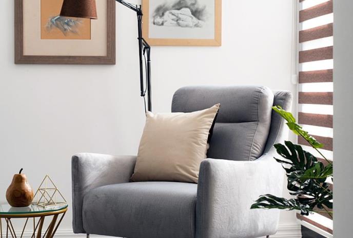 Kao što smo i napomenuli, jednostavne forme su važne, a jedan od primera izuzetno privlačne estetike, a ipak jednostavne forme je fotelja CUBA, koja je izuzetan komad nameštaja za akcentovanje u većem prostoru. Sivi podovi, zidovi svetlo sive nijanse, kao i siva fotelja su ono što čini ovaj ambijent monohromatskim.