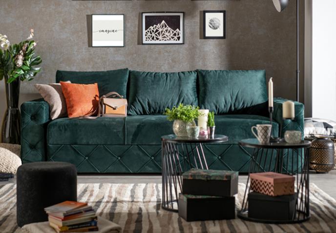 Smaragdno zeleni kauč, poput ležaja BOJANA, sjajan je akcenat u ambijentu, a uz njega se odlično uklapa klub sto BJ-2604, u kombinaciji metala i stakla, kojim se dodatno ističu transparentnost i elegancija prostora.