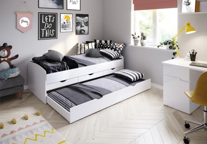 Kako je ukus tinejdžerki podložan promenama kao i moda, i kako omiljena boja koja je danas „in“, može lako postati boja koju ne žele posle par meseci ni u svom garderoberu, ni u svojoj sobi, bilo bi mudro da bar pokušate da utičete da odaberu neutralnu koloritnu bazu za svoju sobu, sa svedenim nameštajem, neutralnih boja. Krevet NICOLE 01 u beloj boji odlično bi se uklopio u ženski tinejdžerski kutak za odmor, a njegova prednost je rezervni ležaj, jer će žurke u pidžamama postati sa tinejdžerskim uzrastom sastavni deo života vaših tinejdžerki. Idealan izbor za radni kutak može biti kompjuter sto LIBER, koji odiše čistoćom i može ih dodatno inspirisati da u svojoj sobi održavaju red i skladnu organizaciju.